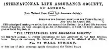- ↑ Miller, George W. (1871). "The International Life Assurance Society". Twelfth Annual Report of the Superintendent of the Insurance Department of the State of New York:Part II. Life and Casualty Insurance. Albany: Argus. pp. 243–244. It is re-printed at page 1216 of Volume III of the New York Insurance Reports.