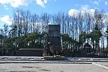 The International Monument to the Victims of Fascism (Polish: Międzynarodowy Pomnik Ofiar Obozu, lit. International Monument to the Victims of the Camp) is a commemorative monument in the Auschwitz II–Birkenau concentration camp in Birkenau (now Brzezinka) in southern Poland. It lies at the western end of the railway lines which cross the camp from the main gate. The monument was designed by Italian architects Andrea and Pietro Cascella, and executed in collaboration with Polish and Italian artists Jerzy Jarnuszkiewicz, Julio Lafuente and Giorgio Simoncini.[1][2][3][4] Completion of the monument took about nine years.[5] It was dedicated on 16 April 1967.[6]:228 Trees were planted behind the monument by the people of Brzezinka.[7]:61
