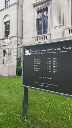 The International Museum of Surgical Science is a museum located in the Gold Coast neighborhood of Chicago, Illinois. It is operated by The International College of Surgeons and features exhibits dealing with various aspects of Eastern and Western medicine. It was founded by Dr. Max Thorek in 1954. The museum's exhibits are displayed by theme or surgical discipline. Displays include photographs, paintings and drawings, sculpture, medical equipment, skeletons, medical specimens and historic artifacts. The library contains more than 5,000 rare medical texts.[2]