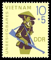 East German solidarity stamp depicting a Vietnamese mother and child with the text "Unconquerable Vietnam"