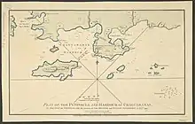 The apparent strength of the battery on Gaspar Grande island, mounting 20 cannon and two mortars, commanded and might have disputed, the entrance to the enemy's anchorage, caused Hardy to order the transports, under the protection of Arethusa, Thorn, and Zebra, to anchor a little further up the gulf, at the distance of about five miles from the town of Port-d'Espagne, while Alarm, Favourite, and Victorieuse kept under sail between the transports and Port-d'Espagne, to prevent any vessels escaping from the latter.[Note 1] In the meantime, the rear-admiral, with his four ships of the line, anchored, in order of battle, within random-shot of the Spanish batteries and line-of-battle ships, to be prepared in case the ships, having all their sails set and appearing to be ready for sea, should attempt during the night to escape.