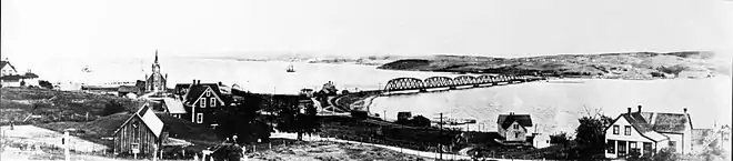 A view of Iona in the early 1900s. St.Columba Church to the left, the Grand Narrows Bridge over the Barra Strait in the background.