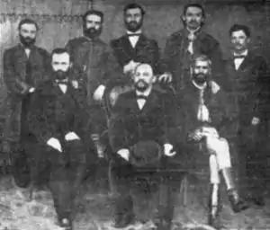 Standing: Ioan Moțiu, court county; George Secula, deputy notary, tax comitatens; Ioan Francu, tax; comitatens, Haralambie Munteanu, notary at the county; Ioan Coșeriu, advisor.