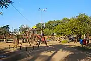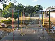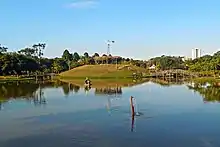 The walking and biking paths that intercede the park allow direct access to nearby neighborhoods, such as Canaã and Iguaçu.[13][14] Besides the lake, there are soccer fields, courts, an amphitheater and a playground for children inside the park.[10] Next to the leisure area is the Science Park, where physical, biological, chemical and astronomical phenomena can be observed or interacted with by the visitor.[10] In the same space as the Science Park and the playground are also the "whispering corner", the "path of the stars", the "water cloud" and the sundial.[15]