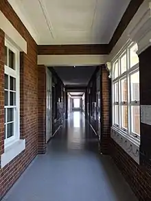 The building retains much of its original timber-framed joinery. Windows to external walls are predominately banks of tall narrow-sash casements with fanlights, set between the face brick pilasters. Windows to the face brick verandah walls are double-hung sashes with fanlights and concrete sills. Classroom doors are low-waisted panelled timber with fanlights. Joinery has been removed to form openings in the face brick walls to the first floor hallway in the west wing. The verandahs have been enclosed with banks of awning windows. The verandah floors are concrete, covered with modern vinyl. Early sinks are retained at the eastern end of the verandahs.[1]