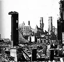 Within the Moody–Sankey mission, Moody preached and Sankey sang. Late in 1871, mission work was interrupted by the Great Chicago Fire, which destroyed 18,000 buildings, killed around 300 people and left a third of the city's population homeless.[10] Sankey watched the conflagration from a small boat in which he rowed out into Lake Michigan.[11] The fire destroyed Moody's church, and Sankey returned temporarily to New Castle. However, he soon received a message from Moody asking him to come back to Chicago and resume the partnership.[7] He did so, and worked with Moody in the revival of churches in Chicago, Springfield and elsewhere.[3] In October 1872 Sankey moved his family permanently to Chicago.[7]