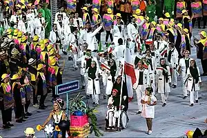 The Iranian roster featured a number of past Olympic medalists, including discus thrower Ehsan Haddadi, who won the nation's first ever athletics medal with a silver, and four defending champions from London: weightlifter Behdad Salimi, and Greco-Roman wrestlers Hamid Sourian, Omid Norouzi, and Ghasem Rezaei. Other notable Iranian athletes included table tennis player Noshad Alamian and his younger brother Nima in the men's singles, rifle shooter and London 2012 finalist Elaheh Ahmadi, and paraplegic archer Zahra Nemati, who significantly became the nation's first ever female athlete to earn an Olympic or Paralympic title four years earlier.[4] Consequently, Nemati's story and sporting success prompted her to lead the Iranian delegation as the nation's third female flag bearer in Olympic history during the opening ceremony.[1]