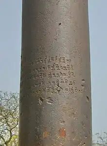 It contains verses composed in Sanskrit language, in shardulvikridita metre.[9] It is written in the eastern variety of the Gupta script. The letters vary from 0.3125″ to 0.5″ in size, and resemble closely to the letters on the Allahabad Pillar inscription of Samudragupta. However, it had distinctive mātrās (diacritics), similar to the ones in the Bilsad inscription of Kumaragupta I.[10] While the edges of the characters on the Allahabad inscription are more curved, the ones on the Delhi inscription have more straight edges. This can be attributed to the fact that the Allahabad inscription was inscribed on softer sandstone, while the Delhi inscription is engraved on the harder material (iron).[11] The text has some unusual deviations from the standard Sanskrit spelling, such as:[10]