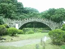 Meganebashi or "Spectacles Bridge" (眼鏡橋) is a double arch stone bridge spanning a pond in the park. The bridge is twice the size of the famous "Spectacles Bridge" in Nagasaki city. The bridge was originally built over the Honmyo river in 1839. After the flood of 1957, it was relocated to the park. Every year on the anniversary of the flood, the city of Isahaya has a festival at the original location of the bridge. It was designated as an Important Cultural Property in 1958.