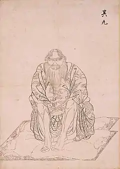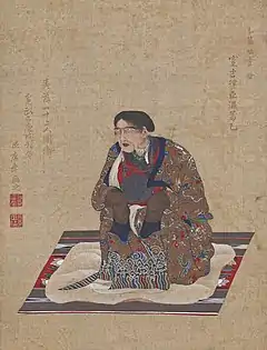 | Chousama (超殺麻), chieftain of Urayasubetsu | with European stockings and shoes under his fur-lined Ezo nishiki robe,[4]: 100 he wears blue bead and cloth tassel earrings and holds a hoe-shaped helmet ornament[1]: 121 (as does the chieftain Tobu in Kakizaki Hakyō's 1783 portrait (see Gallery below)) | ![]() | |