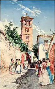 Owing to his precarious financial situation, he practiced a wide variety of artistic activities; including illustrations, posters and lithographs, in addition to the usual paintings, which he made on a variety of media, such as wood, cloth, ceramics and fans. He also did decorative painting for some of the most distinguished families of Granada and worked as an art restorer. For a time, he was a conservator at the Alhambra.