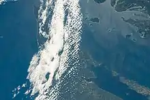 Islands in northern Lake Michigan and eastern Lake Superior on June 17, 2022; taken from the International Space Station. North is oriented towards the upper left. The Beaver Islands are at the top center, with the Manitou Islands at the top right and the Fox Islands between them. At the top right corner are islands inside of Grand Traverse Bay. The Potawatomi Islands are below the Beaver and Manitou Islands, and the Strawberry Islands and Chambers Island are inside of Green Bay in the lower right corner. Caribou Island in Lake Superior is near the left side border.