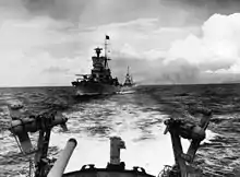 Her power plant consisted of four Parsons steam turbines powered by twelve oil-fired Yarrow boilers, which were trunked into two funnels amidships. Her engines were rated at 150,000 shaft horsepower (110,000 kW) for a top speed of 36 knots (67 km/h; 41 mph).[1] On trials, she reached only 35.6 knots (65.9 km/h; 41.0 mph), and in service, her practical top speed was only 31 knots (57 km/h; 36 mph). The ship had a cruising range of 4,160 nautical miles (7,700 km; 4,790 mi) at a speed of 16 knots (30 km/h; 18 mph).[2]