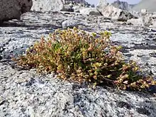 Ivesia lycopodioides is a species of flowering plant in the rose family known by the common name clubmoss mousetail, or clubmoss ivesia. It is native to the Sierra Nevada and to regions east of the range in California. It may also be found beyond the state line into Nevada. This is a perennial herb which grows in the crevices of rock ledges in the mountains and in wet high-elevation meadows. It produces a rosette of flat to cylindrical leaves up to 15 centimeters long, each of which is made up of many tiny, lobed leaflets. The stems may grow erect or drooping to 30 centimeters long and each holds an inflorescence of clustered flowers. Each flower has hairy, greenish triangular sepals and much larger oval-shaped petals of bright yellow. In the center of the flower are usually five stamens and several pistils. There are three subspecies.