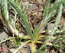 Ivesia sericoleuca is a small perennial herb forming a tuft on the ground. Each leaf is a flat to cylindrical strip of many hairy green leaflets, each individual leaflet 3 to 15 millimeters long and each whole leaf 10 to 20 centimeters long. The mostly naked stem is erect or drooping and reaches a maximum height or length of about 45 centimetres (18 in).