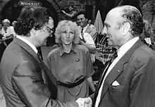 East meets west: Jürgen Schmieder (left) greets Otto Graf Lambsdorff (right) at an inter-party meeting (1990).