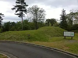 In the Nanatsuzuka Burial Mounds, located approximately 116 meters south, consists of a total of 60 burial mounds, including one zenpō-kōen-fun (前方後円墳), which is shaped like a keyhole, having one square end and one circular end, when viewed from above. It has a total length of 29.5 meters. There are also 2 scallop-shaped kofun, 55 circular-type empun, and two square-type hōfun. [2]