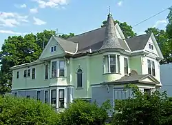 The mass of the house is broken up on every side in different ways, most noticeably at the front. The facade there, facing the street to the west, features the entrance's double wooden doors inside an enclosed porch on the north bay. It in turn has a pedimented roof. Above it rises a small turret with a window in the chamfered north and west and columns that rise to support a steep conical spirelet. To the south of the porch is a large, projecting bay window. This is topped with an overhanging bay on the second story and then the overhanging gabled dormer above it, bracketed by carved swags.[1]