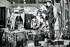 The producers of the Edison Company, by which is meant the stage directors who superintend and are responsible for the action of the picture as well as the development of the plot used, are four in number—Messrs. J. Searle Dawley, Ashley Miller, C. Jay Williams and Oscar C. Apfel. A producer naturally, like any other man, develops a particular aptitude for some certain line of work. Mr. Dawley, for example, has put on some of the biggest and most sumptuous productions the Edison Company has ever produced. As specimens of his work may be mentioned "The Stars and Stripes," "Through the Clouds," "The Red Cross Seal", "Eldora, the Fruit Girl," "An Eventful Evening," "The Black Bordered Letter," "The Doctor" and "The Price of Victory."[21][lower-alpha 7]