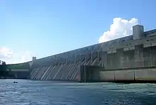J. Strom Thurmond Dam,[1] also known in Georgia as Clarks Hill Dam, is a concrete-gravity and embankment dam located 22 miles (35 km) north of Augusta, Georgia on the Savannah River at the border of South Carolina and Georgia, creating Lake Strom Thurmond. U.S. Route 221 (and Georgia State Route 150 on the Georgia side of the state line) cross it. The dam was built by the U.S. Army Corps of Engineers between 1946 and 1954 for the purposes of flood control, hydroelectricity and downstream navigation. The concrete structure of the dam spans 1,096 feet (334 m) and rises 204 feet (62 m) above the riverbed, housing a power plant with an installed 380 MW capacity. The Dam has prevented over $3.1 million in estimated flood damage annually and also provides recreation, water quality, water supply, along with fish and wildlife management.[2]