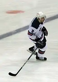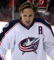 With the 2012–13 NHL lockout halting play to start the year, Johnson spent the lockout training so he would be in the top shape once the game returned.[17] In the shortened 2012–13 season, Johnson was one of the Blue Jackets' alternate captains, and was considered the de facto leader of the team as Columbus nearly qualified for the 2013 playoffs.[18] He scored one of his team's goals in the season closer against the Nashville Predators,[19][20] and broke the Blue Jackets record for most ice time in regulation, nearing 35 minutes in a game against the Detroit Red Wings, which was also the individual record for the season.[15] After his impressive showing of both on-ice skill and leadership, Johnson was considered a front-runner to become Columbus' first full-fledged captain since Rick Nash,[21] though the Blue Jackets ultimately named Nick Foligno as the team's next captain.[22]