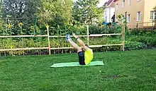 A jackknife is an abdominal exercise. This exercise is also known as a "V-Up". Jackknife exercises are designed to strengthen the upper and lower abdominal muscles, particularly the transversus abdominis muscle. There are a number of variations of jackknife exercises that allow people of different ages and ability to work their abdominal muscles. This exercise can be modified by using an exercise ball. The jackknife can be done by lying flat on your back with your arms extended overhead and your feet raised slightly above the floor. The jackknife is completed by slowly bringing your straight arms toward your hips, and lifting your upper torso off the floor.[1]