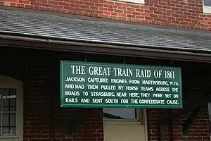 - ↑ Some reports vary such as this July 1901 report from the Passenger Department of the B&O Railroad at archive.org, accessed November 9, 2008: "It was here the wholesale destruction of railroad property of the Baltimore & Ohio Railroad by Stonewall Jackson took place. His army carried away eight B. & O. engines, hauling them by men and horses thirty miles to be placed on Southern roads and used by his army."