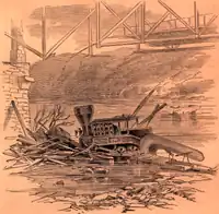 - ↑ Article, Harpers Weekly, July 20, 1861, and woodcut print entitled "Locomotive and tender thrown from the railway bridge at Harpers Ferry by the rebels"