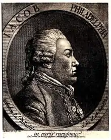 When he converted to Christianity, Jacob Meyer took the name of Jacob Philadelphia in homage to the home city of the American scientist and statesman Benjamin Franklin. He was also known by the names Meyer Philadelphia and Philadelphus Philadelphia. Meyer became a member of the occult Rosicrucian order. After the death of his patron in 1756, Meyer began to perform in public. He exhibited his skills in Ireland, Portugal, and Spain. In 1771, he performed in St. Petersburg for Catherine II of Russia.[4] Also, in Constantinople, he had Sultan Mustapha III as an audience. The year 1773 found him chasing away ghosts for Kaiser Joseph II, Holy Roman Emperor in Vienna[5] at a charge of 300 Thalers. In Potsdam and Berlin, he had difficulty with Friedrich the Great, who was alarmed after Meyer read his mind. Friedrich was also averse to Meyer's Rosicrucianism and subsequently banished the magician from Prussia.