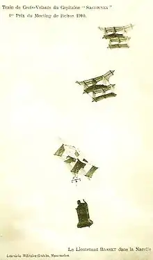 The last exhibition of Saconney's kite was held recently in Soissons, France. The grandson of General Saconney attended the event. An Article in French on the life of General Saconney was written by André Mignard in the review " Lucane " in 1980.[11] In addition, a Saconney kite is part of the permanent exhibition of the Otto Lilienthal Museum in Germany.[12]