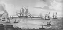 On 6 November Speedy was standing off Europa Point while escorting a merchant vessel and a transport ship laden with wine for the British fleet when twelve Spanish gun boats raced out from Algeciras to launch an opportunistic attack.[22] Although greatly outgunned, Brenton bore down on the enemy ships and opened fire, enabling the merchant ship to escape to safety. The gunboats then concentrated their efforts on capturing the transport ship. Brenton took Speedy amidst the flotilla, close enough to break several oars, while firing broadsides from both sides of the ship and maintaining a brisk musketry for around 45 minutes.[22] The Spanish consequently broke off their attack and ran for the Spanish coast. Meanwhile, Speedy, which suffered two dead, one wounded and extensive damage to her rigging and hull, was unable to pursue and limped to the Moroccan coast off Tétouan to make hasty repairs.[22] Arriving back in Gibraltar the following day, Brenton received widespread praise for his conduct: the Governor of Gibraltar, General Charles O'Hara, urged the Admiralty to award Brenton a promotion and Rear Admiral Horatio Nelson praised Brenton's "uncommon skill and gallantry".[23][24] Just days after his triumph, however, Brenton received news his brother, Lieutenant James Wallace Brenton of HMS Peterel, had been severely wounded during an action with a Spanish privateer. Brenton was given permission to take Speedy to Port Mahon where his brother was undergoing treatment but upon arrival discovered he had died from his injuries.[25]