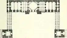 The mosque is built on a base that is nearly 20 feet high and is accessible by a flight of steps.[26] This fact distinguishes it from the Atala Mosque which has no base and is similar to many mosques in Delhi with such a base. Although the general style is influenced by Delhi, some of the arches flanking the pishtaq are believed to be derived from Bengal.[27] The courtyard is surrounded on all sides by cloisters that A. A. Führer claims were two stories high before the second story was destroyed by Sikandar Lodi when he conquered Jaunpur. In the west wall are several mihrabs, each of which are flanked by ornately carved plates.[28] The pishtaq is over 200 feet tall and the dome behind it is 38 feet in diameter. On each side of the portal are two dominating propylons 70 feet long decorated with several arches.[29][30] The mosque is made of brick, some of which was gathered from pre-existing Hindu temples. Although the general style of the Sharqis contains minimal ornamentation some of these fragments of Hindu temples were heavily ornamented.[31]
