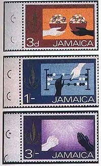 The Jamaica 1968 human rights stamps were a set of three postage stamps produced to mark the 1968 Human Rights year. The Jamaican postal administration approved the designs by Jennifer Toombs. Upon receipt there were objections to the look of the graphics of the hands in black and white. A new design, using brown hands, was printed locally following weeks of debate. Examples of the unissued stamps are known to exist because they had been distributed to philatelic journalists by the Crown Agents and these were not recalled.[1][2]