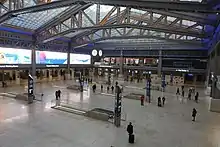Inside the building is Moynihan Train Hall, designed by Skidmore, Owings & Merrill (SOM). It consists of 255,000 sq ft (23,700 m2) of space[23] underneath a 92 ft (28 m) tall glass skylight.[24] The hall also contains 120,000 sq ft (11,000 m2) of retail space.[25] Moynihan Train Hall contains passenger facilities for Amtrak, its primary tenant. These include a ticketing and baggage area, a waiting lounge, conference spaces, and a balcony 20 ft (6.1 m) above the hall.[26]