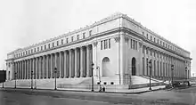 The architect was selected under the Tarsney Act of 1893, which permitted the Supervisory Architect to hold an architectural design competition for U.S. government facilities.[33] Several prominent firms and architects were invited to submit plans in early 1908.[34] Supervisory architect James Knox Taylor selected McKim, Mead & White for the post office the same year.[35][36][lower-alpha 1] By then, steelwork for the tracks and platforms was already under construction.[27] The initial appropriation for the post office building was $2.5 million, but in April 1910, Congress allocated another $1 million for construction.[37] The construction of Pennsylvania Station across the street was progressing more quickly. The as-yet-incomplete Penn Station post office saw its first mail, delivered through the mail platform, when the station officially opened on November 27, 1910.[38][39] A $2.5 million contract to build the Post Office was awarded to the George A. Fuller Company in March 1911.[40][41][42] By December 1913, the post office was already processing second, third, and fourth class mail. The New York Times characterized the new post office as "not only the largest, but the finest in the world" of its kind.[17]