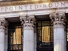 The four-story structure consists of granite ashlar cladding around a steel-frame superstructure.[1]:2 The monumental facade on Eighth Avenue was conceived as a Corinthian colonnade, composed of twenty 53-foot-tall (16 m) columns. The imposing design was meant to match the strength of the colonnade of McKim, Mead, and White's original Pennsylvania Station across Eighth Avenue, which originally faced the General Post Office Building. A flight of 31 steps, extending across the full length of the colonnade, provides access from the street to the main floor.[6][1]:2 The colonnade is braced at the end by two square pavilions, each capped with a low saucer dome, expressed on the exterior as a low stepped pyramid.[1]:2