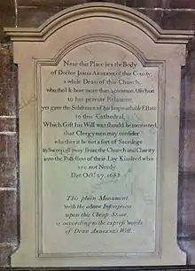 Arderne's devotion to the Stuarts is said to have brought him affronts in his own district so vexatious as to have shortened his life. He died in 1691, but the date of his death is variously given, as 18 August, 16 September, and 18 September. He was buried in the choir of his cathedral, with a monument on which, in accordance with his will, was inscribed: "Here lies the body of Dr. James Arderne, brother of Sir John Arderne, awhile dean of this church; who, though he bore a more than common affection to his private relations, yet gave the substance of his bequeathable estate to this cathedral, which gift, his will was, should be mentioned, that clergymen may consider whether it be not a sort of sacrilege to sweep away all from the church and charity into the possession of their lay kindred who are not needy". The particular intention of Arderne in this bequest was the foundation of a public library. The property was not then large, but was increased by the reversion to the younger branch of the Ardernes of the property of Mrs. Jane Done.[3]
