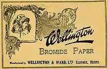 Back in England he became a manager of Kodak's factory in Wealdstone and was responsible for a number of practical formulas for improving emulsions and developers, one being a negative intensifier containing silver nitrate, ammonium thiocyanate and sodium thiosulphate, and another being dry-collodion plates with improved sensitivity.[3] Around 1895 he and his brother-in-law H. H. Ward set up a photographic paper manufacturing company, Wellington & Ward. The firm later extended into plates and film manufacture. In July 1922 the company acquired Leto Photo Materials (1905) Ltd, and in 1929 was taken over by Ilford Ltd. Before this Wellington had worked for Elliott & Fry of Chipping Barnet.[4][5][6][7]