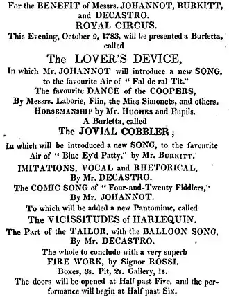 - ↑ Decastro, Jacob (1824). The memoirs of J. Decastro, comedian. In the course of them will be given anecdotes of various eminently distinguished characters... Amongst others are Dr. Johnson, Garrick, Foote,...accompanied by an analysis of the life of the late Philip Astley. Also an accompanying History of the Royal circus, now the Surrey theatre; and an historical sketch of Sadler's Wells. Likewise scarce theatrical advertisements, from Garrick's first attempt in Goodman's-Fields... To which will be added The origin of poetry; A chapter on Bent's, &c... London: Sherwood Jones & Company. pp. 22–23.