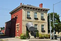 The Brooks House is a stone building with a brick foundation, an asphalt roof, and additional elements of stone and iron.[1] Its basic plan is a simple rectangle, two stories tall, with an exposed basement. Additional rooms are created by a rear extension that was formed by walling up a large two-story veranda.[2] The facade is three bays wide, with windows in the central and eastern bays of all three floors; the western bay is occupied by a window (second story) and the main entrance (first story), while the western bay of the basement is blocked by a small staircase. Pilasters with Ionic capitals separate the second-story windows, while no comparable ornament is present below. A shallow hip roof covers the building, pierced by chimneys on either side, while its overhang permits room for a cornice composed of large bracket. The sides are noticeably plainer, with the most prominent element of the western side being a simple fire escape.[3]