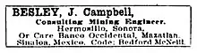 In 1908, Besley sold the Noche Bueno mine, located near Soyopa, Sonora, Mexico to Charles P. Reinigar, an Ohio owner of mines throughout Mexico.[64] Besley retained an interest in the mine. This became a point of contention and caused a subsequent lawsuit that Besley lost to Reiniger on appeal in 1914.[65]
