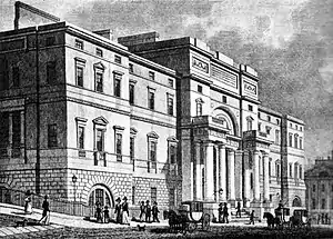 In 1860 Marischal College merged with the neighbouring King's College to form the University of Aberdeen. There was no room for two professors of Natural Philosophy, so Maxwell, despite his scientific reputation, found himself laid off. He was unsuccessful in applying for Forbes's recently vacated chair at Edinburgh, the post instead going to Tait. Maxwell was granted the Chair of Natural Philosophy at King's College, London, instead.[73] After recovering from a near-fatal bout of smallpox in 1860, he moved to London with his wife.[74]