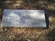 On July 15, 1848, James Copeland and his gang rode to James Harvey's home on Red Creek in Perry County (now Forrest County), Mississippi. They had been offered one-thousand dollars by Wages' father, to avenge his son's death. Here, the Copeland clan fought a blazing gun battle, which resulted in the death of Harvey and one of Copeland's men.[4] Friends carried the mortally wounded Harvey to John Dale's home in northwestern Harrison County (now Stone County), where he died several days later and was buried in the nearby Dale Cemetery. In 1974, Harvey's remains were exhumed and reinterred in Pearl River County, Mississippi.[5]