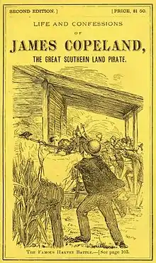 Cover of Pitts' 1874 book on the life of James Copeland depicting "The Famous Harvey Battle".