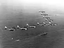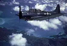 Ramage reported to Enterprise in Noumea in February 1943.[11] After qualifying to land on a carrier in Noumea in April 1943, he was assigned to Bombing Squadron Ten (VB-10), one of the carrier's two dive bomber squadrons flying the Douglas SBD Dauntless as its executive officer.[12] Shortly afterwards, Enterprise returned to Pearl Harbor for overhaul, and Ramage returned to the United States with his wife.[13] The squadrons of Carrier Air Group 10, of which VB-10 was a part, were reequipped with new aircraft, with VB-10 receiving new SBD-5s to replace its older SBD-3 models.[14] Air Group 10 returned to Hawaii in November 1943, and the whole group qualified for night operation, making two night landings on Enterprise in January 1944. Ramage saw his first combat in the Battle of Kwajalein in January 1944, and participated in the attack on Truk in February and landings at Hollandia in April. He became commander of VB-10 in March.[15]
