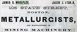 After his second marriage, and as early as 1863, Whelpley formed a partnership with Col. Jacob Jones Storer (1826–1902), to design and manufacturer mining equipment.[11] (Storer, a New Hampshire born son of Adm. George Washington Storer, had entered military service as a major with the 13th New Hampshire Infantry Regiment on September 23, 1862, was promoted to lieutenant colonel on June 1, 1863, and was mustered out in May 1864 owing to disability.) In 1867, The American Journal of Science and Arts described Whelpley & Storer's "General Metallurgical method", noting that: