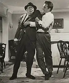 In 1947, largely on the basis of his performance in A Tree Grows in Brooklyn, Dunn was cast as Jamie Tyrone, a man who resorted to drink to forget his unhappy past, in Eugene O'Neill's semi-autobiographical play A Moon for the Misbegotten.[23] Considered the "name" actor in the production, Dunn was given a run-of-the-play contract and $1,000 per week, compared to the $750 per week salary of fellow performer J. M. Kerrigan.[23] During rehearsals, O'Neill was dissatisfied with Dunn's portrayal of Tyrone, a character based on O'Neill's brother, claiming that Dunn "wasn't playing the role with enough gentlemanliness". The director defended Dunn's interpretation of the script.[56] Meanwhile, Dunn felt out of his league playing tragedy rather than comedy. He had never seen an O'Neill play and said his wife had persuaded him to take the part for the "prestige".[57] The production budget was increased by 10% to enable dress rehearsals to take place in New York rather than in the first out-of-town tryout in Columbus, Ohio, in order to accommodate Dunn's poor health.[58] While Dunn's performance garnered critical praise on the tour,[59] he left the production before it reached Broadway.[12]