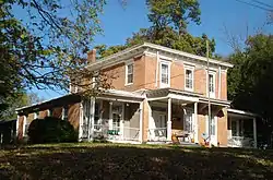 The Gamble House is a two-story brick structure built on a limestone foundation. It reflects the Italianate palazzo style.[2] The bricks are laid in a 6-course common bond. The central block of the house is three bays wide and it is flanked by single-story wings that are two bays wide. The house is capped by a low hipped roof with broad eaves. The wings also feature low hips with plain, narrow cornices. The main entrance is located off-center to the left and it is framed with sidelights and a transom. The porch is possibly a later construction.[2] Its flat roof is supported by two wooden columns on high pedestals. To the right of the entrance is a narrow, flat roof that is supported on large brackets that overhangs two tall windows. The porches on the side wings are simple structures with square, freestanding and engaged posts. The balustrades are very slender, turned spindles that are similar to those of the entrance porch. Behind the rear of the house is a single-story wing that was probably used as a summer kitchen. It is attached to the main house block by a long roof that is supported by slender posts with fringed edges that are similar to those on the front porch.