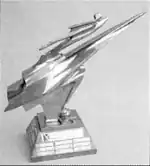 The Doolittle Trophy is a bronze form melding an aerodynamic shape, a stylized spacecraft, and a winged human figure. The aerodynamic shape stands for the scientists and engineers who provide technological breakthroughs. The spacecraft represents continued growth of the aerospace industry. The human figure represents the pilot who guides the test effort to reach its goals. A helmet and goggles rest on the base of the trophy symbolizing the tools of the early test pilot and Jimmy Doolittle himself. Plaques bearing the name of each honoree are mounted around the sides of the teak base.[2]