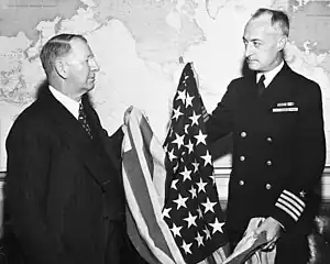 He served in the Navy Department, Headquarters of the Commander in Chief, US Fleet, from November 1943 to April 1945, and after brief duty with Commander Cruisers, Pacific Fleet, he assumed command in May of that year of the USS Pasadena. He was awarded the Bronze Star Medal with Combat "V," for this final period of the war. The citation states in part: "For meritorious service as the Commanding Officer of the USS Pasadena...in the Western Pacific area from June 2 to September 1, 1945. Exercising ability and initiative, (he) skillfully directed his vessel in three anti-shipping sweeps and one shore bombardment in Japanese Empire home waters, in addition to outstanding service as a unit of the support force of the SECOND Carrier Task Force. Later, during the initial entry and occupation phases at Sagami Wan, (he) ably conducted his vessel as Flagship for the Commander of the Support Force..." Detached from command of the Pasadena in May 1946, he was a member of the Military Staff Committee of the Security Council, United Nations, at the United Nations Headquarters in New York. He remained there until September 1947, when he became Inspector-Instructor of Naval Reserves in the Thirteenth Naval District, with headquarters in Seattle, Washington. He was promoted to rear admiral to date from 7 August 1947. Ordered in January 1948 to the Amphibious Training Command, Pacific Fleet, based at Coronado, California, he assumed command of that unit on 26 March of that year, and in January 1950 reported as Commander Amphibious Group ONE, with additional duty as Commander Transport Squadron ONE. He was later detached from the additional duty.
